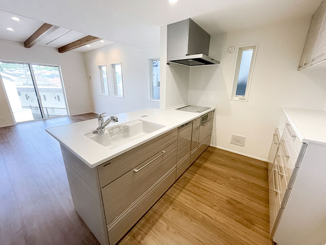 LDKには人気の対面式キッチンで、忙しい日々を食洗機がサポートします。